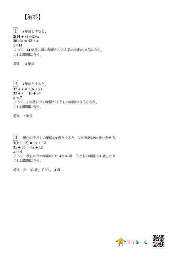 年齢に関する問題でのポイントは、だれもが同じ数だけ歳をとることで、 それさえおさえておけば大丈夫です。