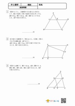 中3数学相似(平行四辺形) 平行線の錯角を利用して、2組の等しい角から相似な三角形を見つける問題です。 蝶々型の相似を利用して線分の比を出していきましょう。 最初の相似で出した線分比を別の相似に利用する場合も多々あるので、どんどん比を記入していってくださいね。 ...中3数学図形の相似
