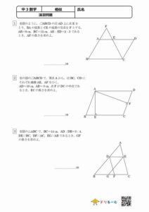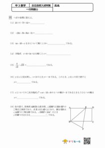 中3数学 練習プリントが無料でダウンロード・印刷できます。 2025.11.25 2020.01.30中3 学習単元一覧 式の展開 因数分解 平方根 2次方程式 2乗に比例する関数 図形の相似 三平方の定理 円の性質 標本調査 私立高校入試対策 公立高校入試対策 定期テスト対策 式の展開式の展開の基礎乗法公式1乗法公式2乗法公式3乗法公式の利用1乗法公式の利用2式の証明式の展開 (利用)式の展開 (基礎練習)式の展開 (乗法公式のまとめ)式の展開 (超基礎練習)式の証明 (図形編) 因数分解因数分解の基礎因数分解公式1因数分解公式2因数分解公式3因数分解(2段階)因数分解(置換)因数分解(発展)因数分解(利用)因数分解 (基礎のまとめ) 平方根ルートの計算 (基礎)分母の有理化ルートの加法・減法ルートの四則計算展開の利用平方根 (ルートの大小)平方根 (利用①)平方根 (利用②)平方根 (基礎のまとめ)平方根 (計算のまとめ)平方根 (ルートを簡単にする 1~100)平方根 (正誤問題) 2次方程式因数分解を利用した計算平方根を利用した解き方解の公式文章題(整数編)文章題(面積編)文章題(道幅編)計算(発展)文章題(体積編)まとめ計算のまとめ文字の値 2乗に比例する関数2乗に比例する関数 (基礎)2乗に比例する関数(グラフの式を求める)変化の割合変域座標と面積総合問題動点2乗に比例する関数 (利用)2乗に比例する関数 (利用②)2乗に比例する関数 (変化の割合・変域のまとめ)2乗に比例する関数 変域(発展) 図形の相似相似の基礎三角形の相似条件相似の証明平行線と相似平行線と線分の比中点連結定理相似(応用問題)相似(平行四辺形)平行線と相似②演習問題 三平方の定理三平方の定理 (基礎)三角定規三角形の いろいろな長さ二等辺三角形の面積三平方の定理(四角形の対角線)三平方の定理(図形の面積)三平方の定理(直方体の対角線)三平方の定理(2点間の距離)三平方の定理 (円すい・角すいの体積)三平方の定理 (最短距離)三平方の定理 (基礎演習) 円の性質円周角と中心角 標本調査標本調査 私立高校入試対策一行問題①一行問題②一行問題③一行問題④ 公立高校入試対策一行問題①一行問題②文章題関数(ダイヤグラム)面積比一行問題③【公立高校入試対策】平面図形一行問題④空間図形一行問題⑤ 定期テスト対策1学期中間テスト対策1学期対策 模擬テスト2学期中間 模擬テスト2学期末 模擬テスト
